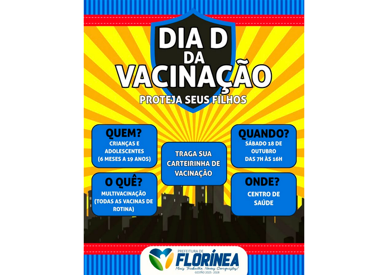 Neste sábado, 18 de outubro, a Prefeitura de Florínea, por meio da Secretaria Municipal de Saúde, realiza o Dia D da Vacinação, uma ação voltada à atualização da caderneta vacinal de crianças e adolescentes de 6 meses a 19 anos.