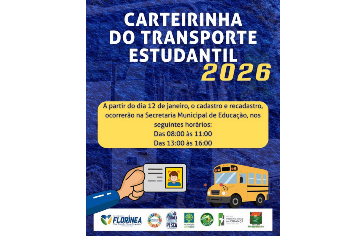 A Prefeitura de Florínea iniciou na segunda-feira, 12 de janeiro, o cadastro e recadastro da Carteirinha do Transporte Estudantil 2026. O atendimento será realizado presencialmente na Secretaria Municipal de Educação, em dois períodos, das 8h às 11h e das 13h às 16h.