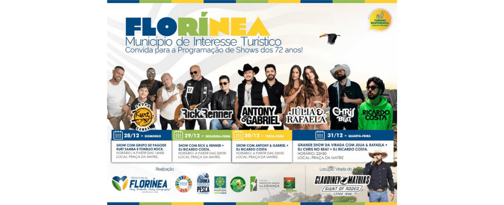 Na quarta-feira, Florínea realiza o Grande Show da Virada, com apresentação de Júlia e Rafaela, além dos DJs Chris No Beat e Ricardo Costa. A programação também começa a partir das 22h30 e segue durante a virada para 2026, fechando as comemorações do aniversário do município.