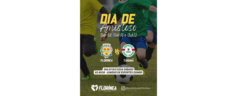 O município de Florínea recebe neste sábado, 7 de março, um amistoso de futebol de base entre as equipes de Florínea e Tarumã. O confronto está marcado para às 8h30 no Ginásio de Esportes “Zuinão”.