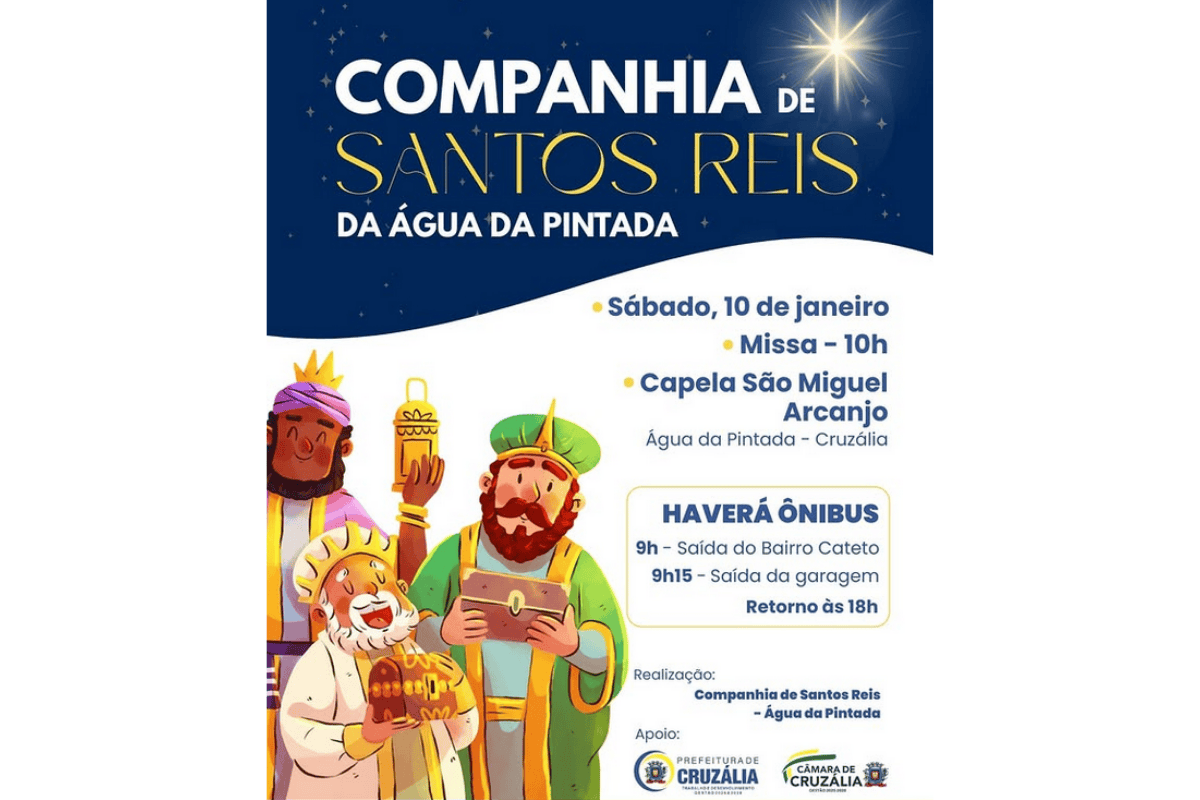 A tradicional Festa de Folia de Reis de Cruzália será realizada neste sábado, 10 de janeiro, a partir das 10h, com organização da Companhia de Santos Reis da Água da Pintada. O evento acontece na Capela São Miguel Arcanjo, no bairro Água da Pintada, e mantém viva uma das mais importantes manifestações culturais e religiosas do município.