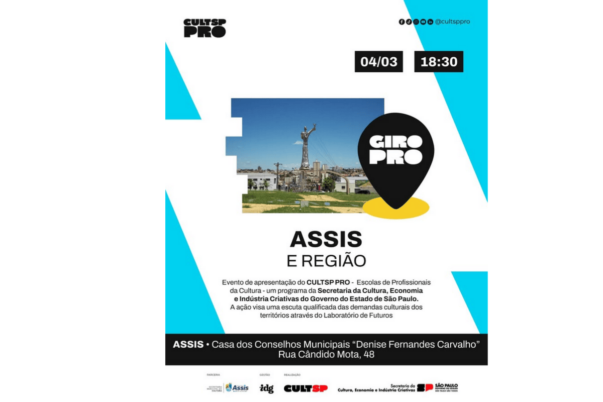 Assis recebe na próxima quarta-feira, dia 4 de março, às 18h30, o GIRO PRO, iniciativa do CULTSP PRO, programa da Secretaria da Cultura, Economia e Indústria Criativas do Estado de São Paulo. O evento acontece na Casa dos Conselhos Municipais “Denise Fernandes Carvalho”, na Rua Cândido Mota, 48, Vila Central, com apoio da Prefeitura de Assis.