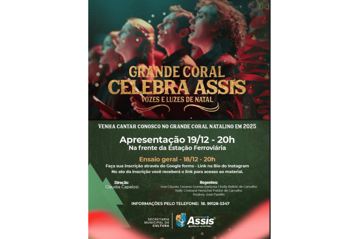 A Prefeitura de Assis, por meio da Secretaria Municipal de Cultura, promove nesta semana o Grande Coral Celebra Assis - Vozes e Luzes de Natal, que integra a programação oficial do Natal 2025 no município. O ensaio geral está marcado para esta quinta-feira, 18 de dezembro, às 20h, e a apresentação ao público acontece na sexta-feira, 19 de dezembro, também às 20h, em frente à Estação Ferroviária.