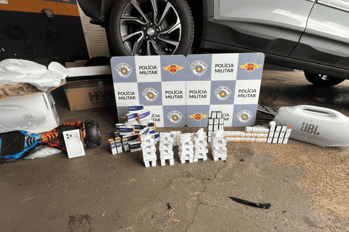 No porta-malas também foram encontrados um iPhone 17 Pro Max, uma caixa de som JBL e um hoverboard, todos sem nota fiscal.