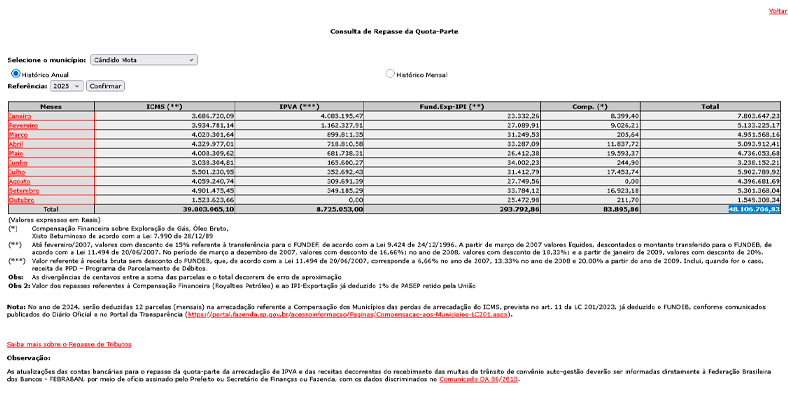 No histórico anual de 2025, o total de repasses estaduais destinados a Cândido Mota já soma R$ 48.106.706,83, de acordo com os dados da Sefaz-SP. O detalhamento mensal mostra a consistência das transferências: