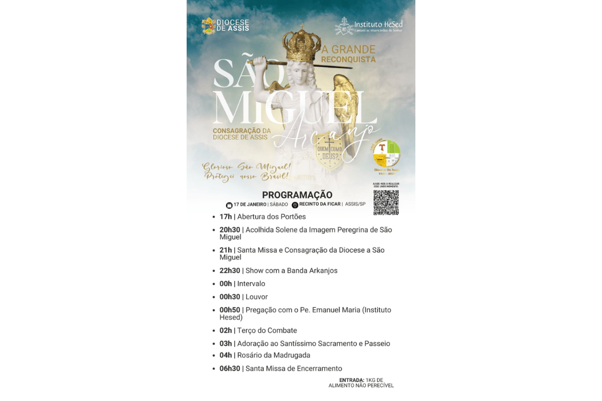 A cidade de Assis será palco, neste sábado, 17 de janeiro, de um dos momentos religiosos mais significativos de sua história recente. A Diocese de Assis realiza a consagração diocesana a São Miguel Arcanjo durante a passagem da Imagem Peregrina oficial do Arcanjo, vinda do Monte Gargano, na Itália, local reconhecido pela Igreja como berço histórico da devoção a São Miguel. A programação acontece no Recinto da Ficar e se estende da noite de sábado até a manhã de domingo.