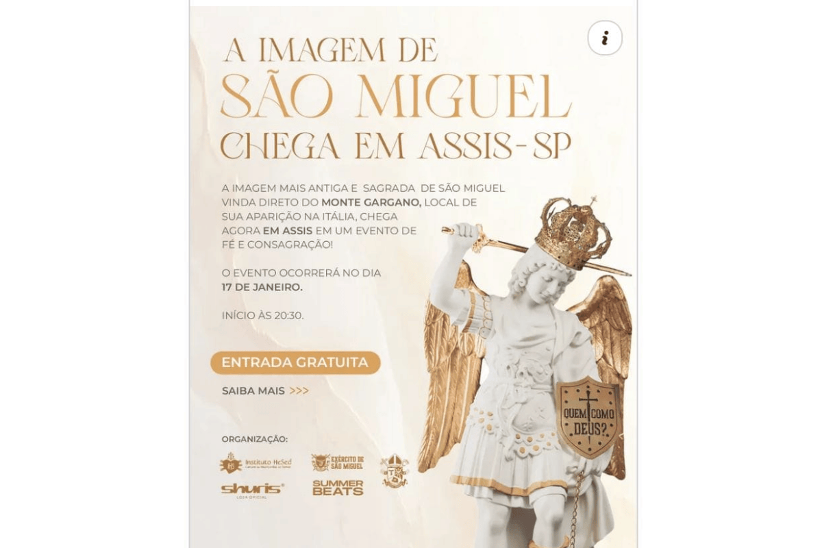 A celebração em Assis integra a Peregrinação Nacional conduzida pelo Instituto Hesed, movimento que percorre dioceses brasileiras com o objetivo de promover renovação da fé, consagração das comunidades e fortalecimento da espiritualidade cristã. A imagem que chega à cidade foi solenemente abençoada no próprio santuário de Gargano, no sul da Itália, e percorre o Brasil em uma agenda que mobiliza milhares de fiéis por onde passa.