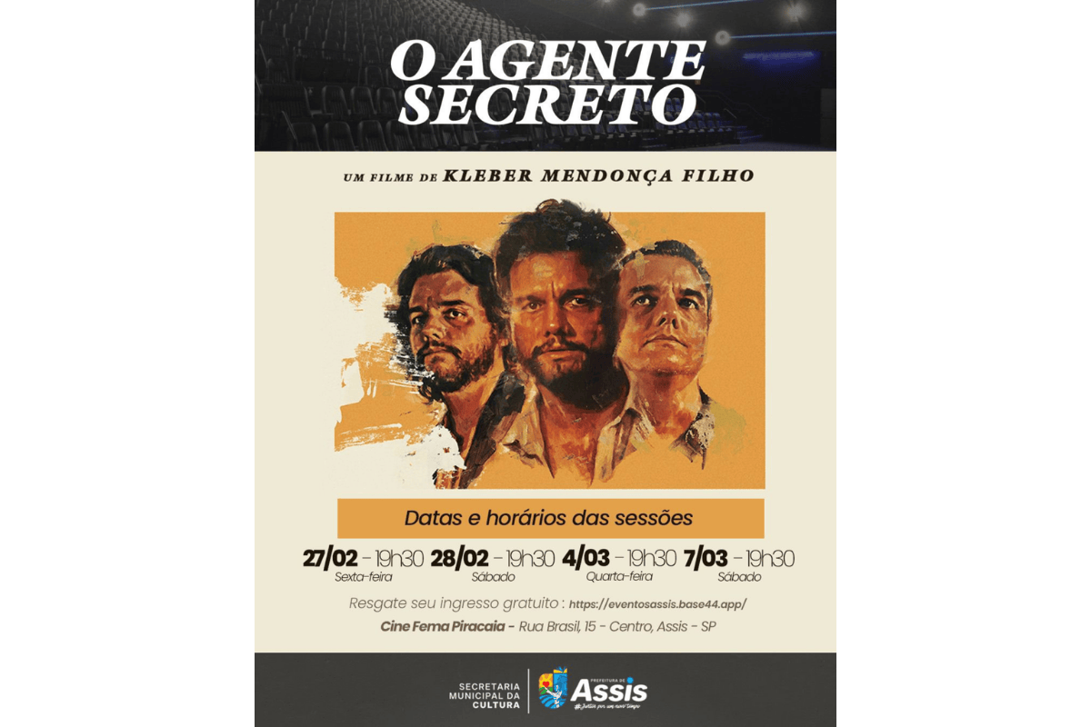 O filme “O Agente Secreto”, dirigido por Kleber Mendonça Filho, terá exibição gratuita em Assis a partir do dia 27 de fevereiro, sexta-feira, no Cine Fema Piracaia. As sessões acontecem às 19h30, com ingressos disponibilizados previamente pela internet devido à capacidade limitada da sala.