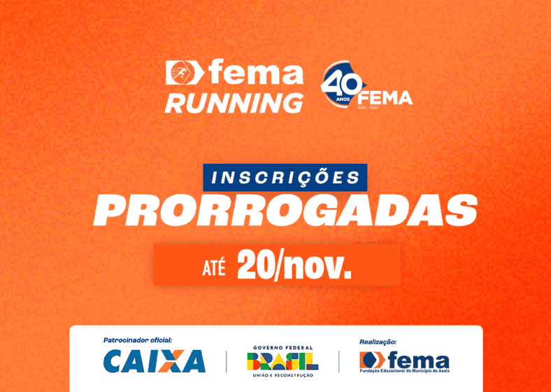 A Fundação Educacional do Município de Assis prorrogou até o dia 20 de novembro o prazo de inscrições para a terceira edição do FEMA Running. A prova será realizada no domingo, 23 de novembro de 2025, com largada às 7h30, no campus da instituição. A corrida terá percurso de 5 km e a caminhada 2 km, com valores de R$ 70,00 e R$ 25,00 respectivamente, ambos com vagas limitadas. O evento conta com patrocínio da Caixa Econômica Federal.