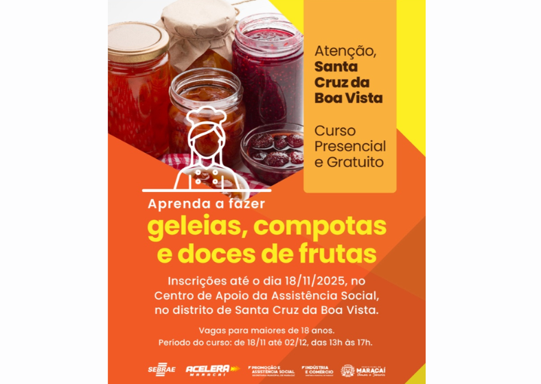 As inscrições para o curso presencial e gratuito de geleias, compotas e doces de frutas oferecido em Santa Cruz da Boa Vista se encerram na próxima terça-feira, 18 de novembro. A capacitação é promovida pela Prefeitura de Maracaí em parceria com o Sebrae e tem como objetivo estimular a geração de renda na comunidade.