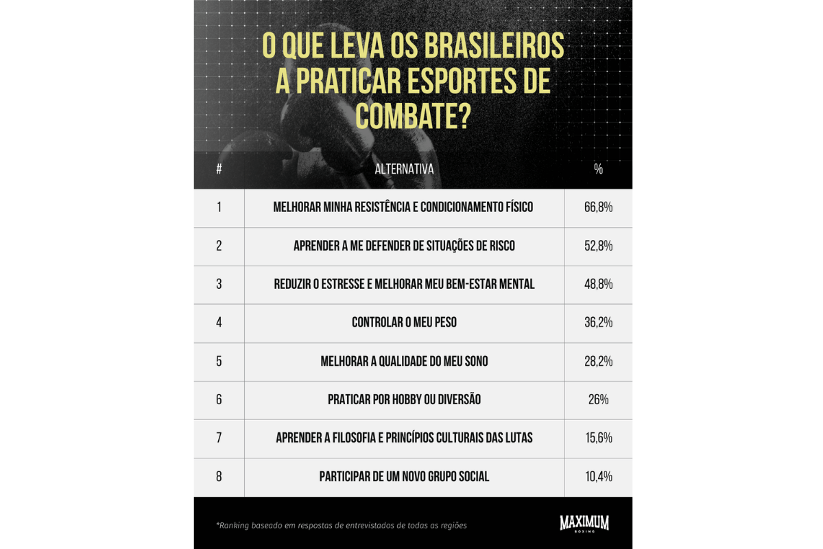 Entre os esportes de combate, o jiu-jitsu lidera o interesse com 36% das preferências, seguido pelo muay thai, com 35%, e pelo boxe, com 30%. A motivação vai além da prática física. Para 66,8% dos entrevistados, o principal objetivo é melhorar o condicionamento, enquanto 52,8% buscam aprender técnicas de defesa pessoal e 48,8% apontam a redução do estresse como fator decisivo.