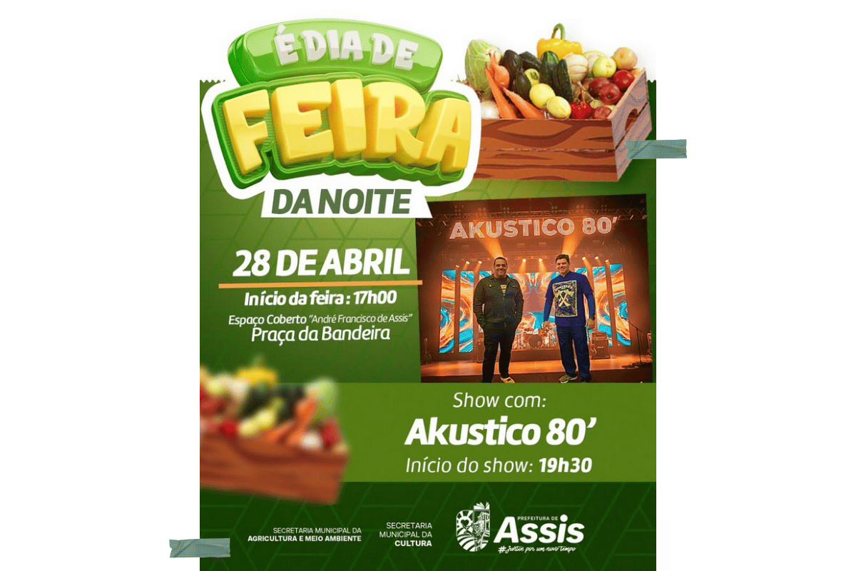 A tradicional Feira da Noite volta a movimentar o centro de Assis nesta terça-feira (28), com início às 17h, no Espaço Coberto “André Francisco de Assis”, na Praça da Bandeira. A proposta reúne produtos frescos, gastronomia variada e programação cultural, consolidando o evento como uma das principais opções de lazer durante a semana.