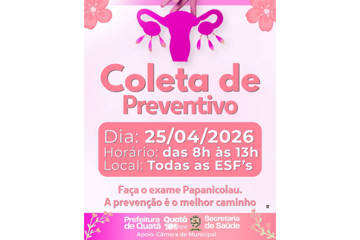 Mulheres de Quatá terão uma oportunidade ampliada para realizar o exame preventivo no último sábado de abril. No dia 25, das 8h às 13h, todas as Estratégias de Saúde da Família (ESFs) do município estarão mobilizadas para a coleta do exame Papanicolau, procedimento fundamental para prevenção e detecção precoce do câncer do colo do útero.
