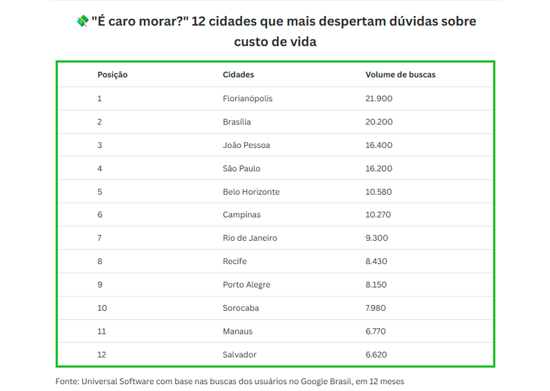 A dúvida sobre o custo de vida em cidades brasileiras movimentou mais de 1 milhão de pesquisas no Google nos últimos 12 meses, segundo levantamento da Universal Software, empresa especializada em gestão imobiliária. A análise identificou as 12 localidades mais buscadas por quem deseja saber se “é caro morar” em determinadas regiões do país. Florianópolis (SC), Brasília (DF) e João Pessoa (PB) ocupam as primeiras posições do ranking, refletindo a preocupação crescente dos brasileiros em equilibrar qualidade de vida e despesas básicas.