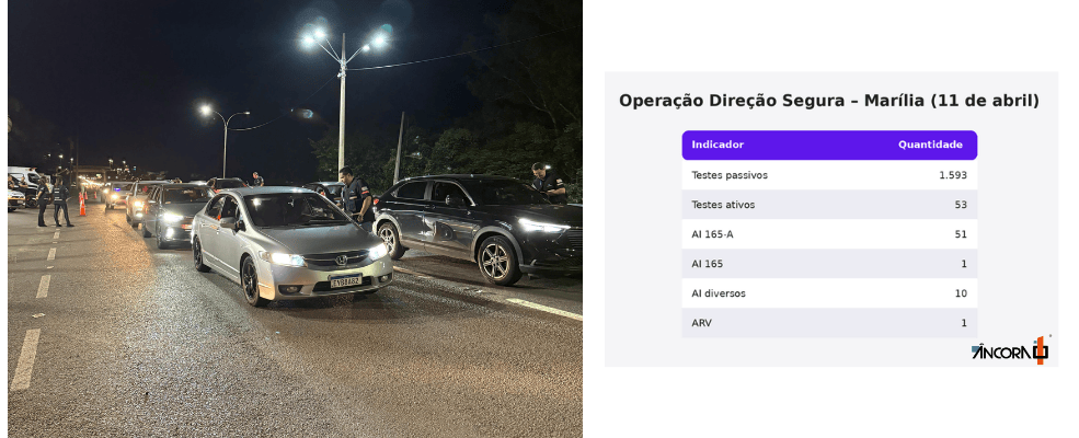 Uma operação da Polícia Militar Rodoviária em conjunto com o Detran-SP, Polícia Civil e apoio da concessionária Entrevias flagrou dezenas de motoristas dirigindo sob efeito de álcool na noite deste sábado (11), na Rodovia Comandante João Ribeiro de Barros (SP-294), em Marília. A ação ocorreu entre 20h e 2h, no km 452,600, no sentido Oeste, com o objetivo de aumentar a segurança viária e reduzir riscos de acidentes.