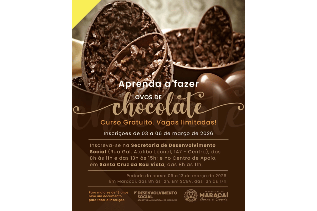 A Secretaria de Desenvolvimento Social de Maracaí abriu inscrições para o curso gratuito de produção de ovos de chocolate. A iniciativa é voltada a maiores de 18 anos e busca oferecer capacitação para geração de renda no período que antecede a Páscoa.