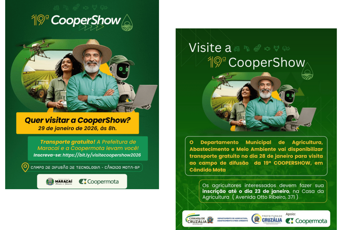 Já em Cruzália, a Prefeitura Municipal, por meio do Departamento Municipal de Agricultura, Abastecimento e Meio Ambiente, também está organizando uma caravana especial para a 19ª Coopershow no dia 28, quarta-feira. A iniciativa busca oferecer aos produtores rurais a oportunidade de contato direto com novas tecnologias, equipamentos e soluções voltadas ao fortalecimento da atividade agrícola. As inscrições estão sendo realizadas presencialmente na Casa da Agricultura do município.