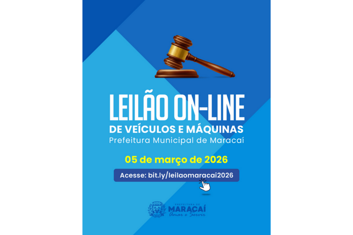 A Prefeitura Municipal de Maracaí realizará, no dia 5 de março de 2026, um leilão on-line de veículos e máquinas pertencentes ao patrimônio público municipal. A iniciativa tem como objetivo a alienação de bens considerados inservíveis, garantindo transparência, acesso ampliado e igualdade de condições aos interessados.