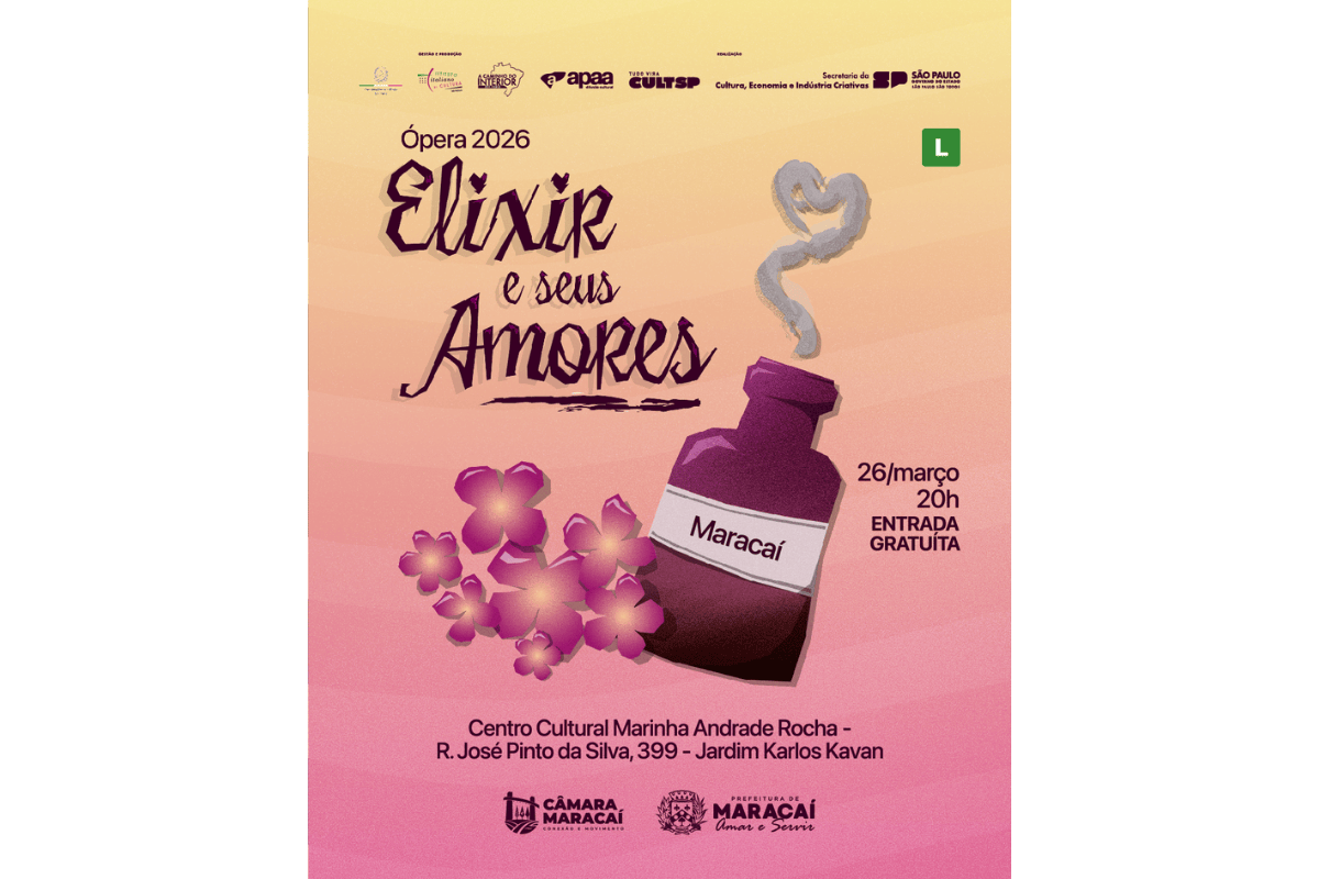 A cidade de Maracaí receberá na quinta-feira, dia 26 de março, às 20h, o espetáculo “Elixir e seus Amores”, apresentação cênica que reúne trechos de famosas óperas italianas. O evento será realizado no Centro Cultural Marinha Andrade Rocha, com entrada gratuita e ingressos limitados, distribuídos antecipadamente pela Prefeitura.