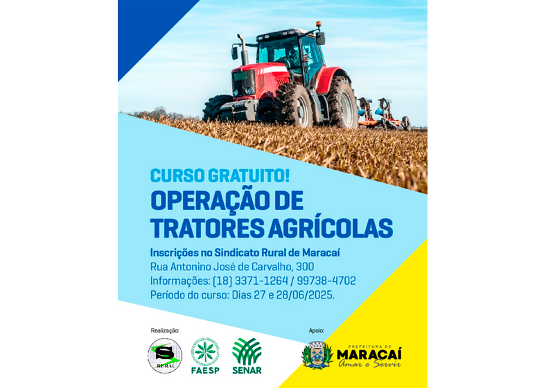A cidade de Maracaí está com inscrições abertas para um curso gratuito de Operação de tratores agrícolas, que será realizado nos dias 27 e 28 de junho de 2025. A capacitação é promovida pelo Serviço Nacional de Aprendizagem Rural (SENAR) e pela Federação da Agricultura e Pecuária do Estado de São Paulo (FAESP), com apoio da Prefeitura Municipal.