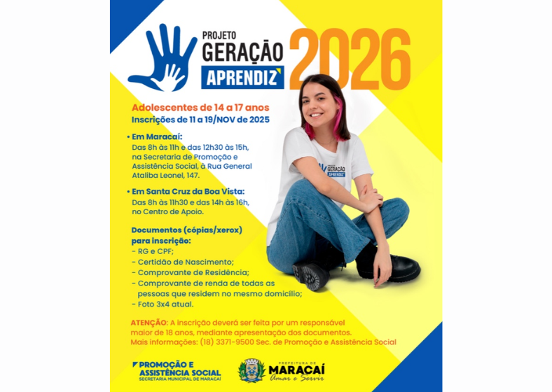 A Prefeitura de Maracaí, por meio da Secretaria Municipal de Promoção e Assistência Social, abriu nesta terça-feira, 11 de novembro, as inscrições para o Projeto Geração Aprendiz 2026, voltado a adolescentes de 14 a 17 anos que desejam dar o primeiro passo rumo à inserção no mercado de trabalho.
