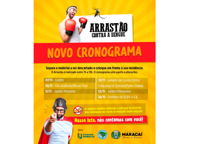 A Prefeitura de Maracaí segue com o Arrastão Contra a Dengue, campanha que mobiliza equipes de limpeza e agentes de saúde para eliminar criadouros do mosquito Aedes aegypti. O novo cronograma prevê a continuidade das ações entre segunda e sexta-feira, de 10 a 14 de novembro, com coletas realizadas sempre das 7h às 13h.