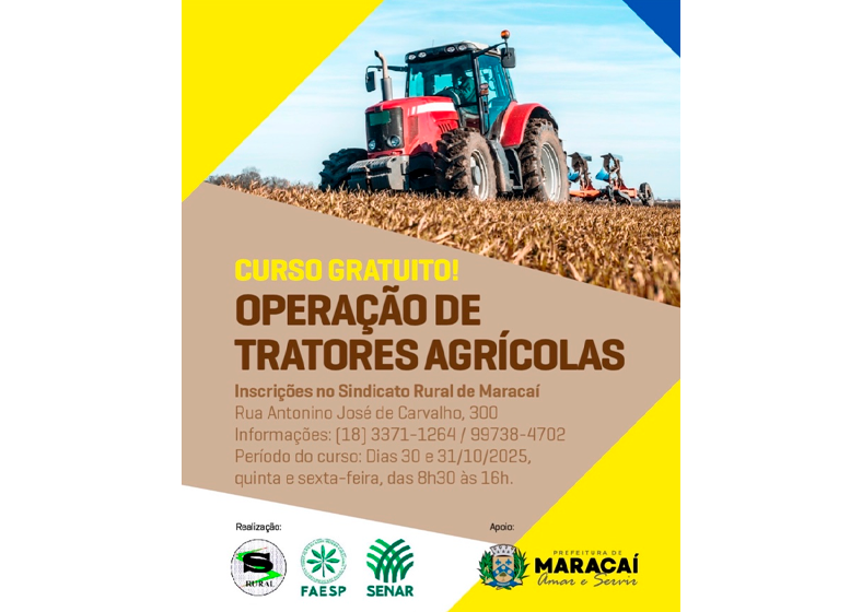 A Prefeitura de Maracaí, em parceria com o Serviço Nacional de Aprendizagem Rural (SENAR), o Sistema FAESP e o Sindicato Rural de Maracaí, anunciou a abertura das inscrições para o curso gratuito de Operação de Tratores Agrícolas. A formação será realizada nos dias 30 e 31 de outubro, quinta e sexta-feira, das 8h30 às 16h, no Sindicato Rural de Maracaí, localizado na Rua Antonino José de Carvalho, 300.