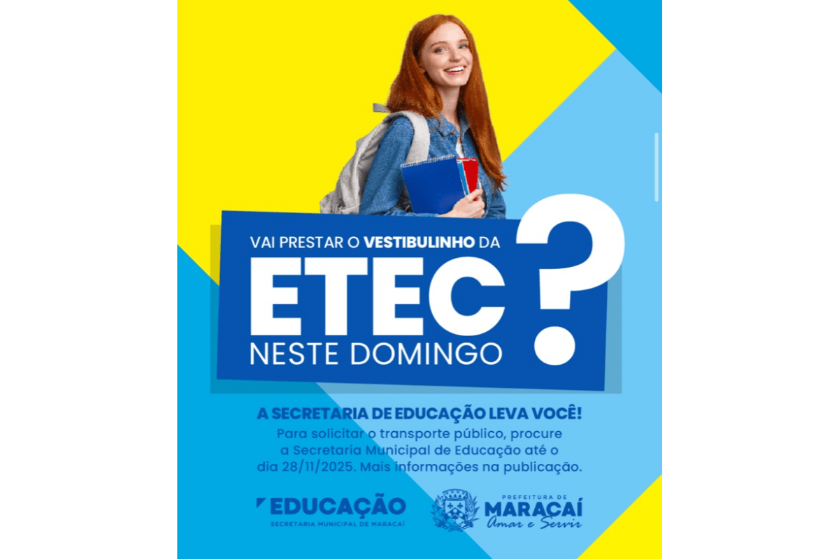 A Secretaria Municipal de Educação de Maracaí mantém abertas até esta sexta-feira, 28 de novembro, as inscrições para o transporte público destinado aos estudantes que irão prestar o vestibulinho da Etec neste domingo. O atendimento ocorre na própria Secretaria, em horários específicos, e é necessário apresentar documentação para garantir a vaga.