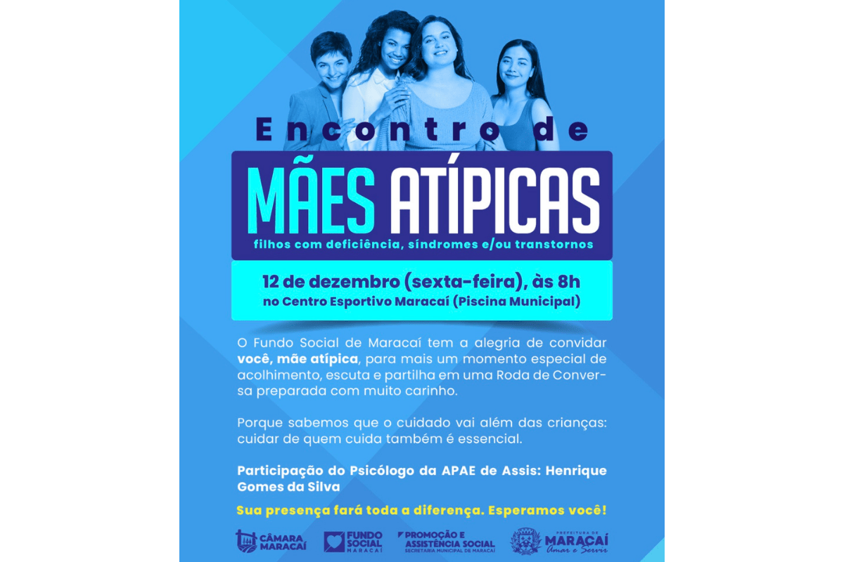 O Fundo Social de Maracaí promove nesta sexta-feira, 12 de dezembro, às 8h, no Centro Esportivo Maracaí, a Piscina Municipal, um encontro dedicado às mães atípicas, aquelas que cuidam de crianças com deficiência, síndromes e ou transtornos. O objetivo é oferecer um espaço de acolhimento, escuta qualificada e partilha de vivências em uma roda de conversa preparada especialmente para o grupo.