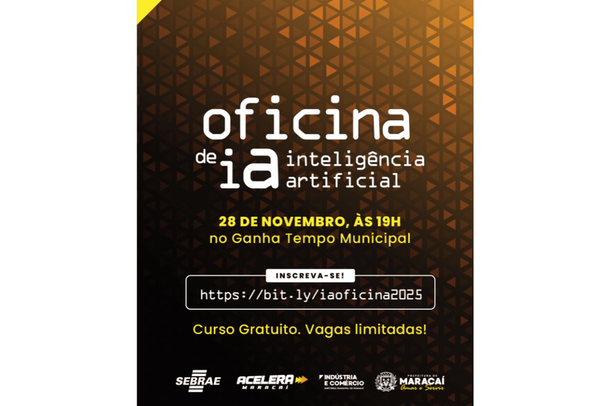 A Prefeitura de Maracaí realiza nesta sexta-feira, 28 de novembro, às 19h, uma oficina gratuita de inteligência artificial no Ganha Tempo Municipal. A iniciativa, organizada em parceria com o Sebrae e com a Secretaria Municipal de Indústria e Comércio, oferece capacitação prática para quem deseja aprender a utilizar ferramentas de IA no dia a dia, seja em atividades pessoais, profissionais ou empreendedoras.