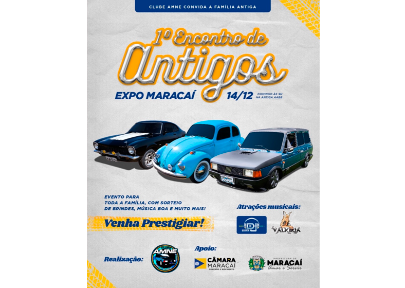 O 1º Encontro de Antigos é uma realização do Clube AMNE, com apoio da Câmara Municipal de Maracaí e da Prefeitura de Maracaí.