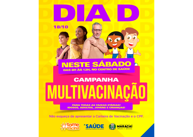 A Prefeitura de Maracaí, por meio da Secretaria Municipal de Saúde, realiza neste sábado, 18 de outubro, o Dia D da Campanha de Multivacinação, com atendimento especial das 8h às 12h, no Centro de Saúde.