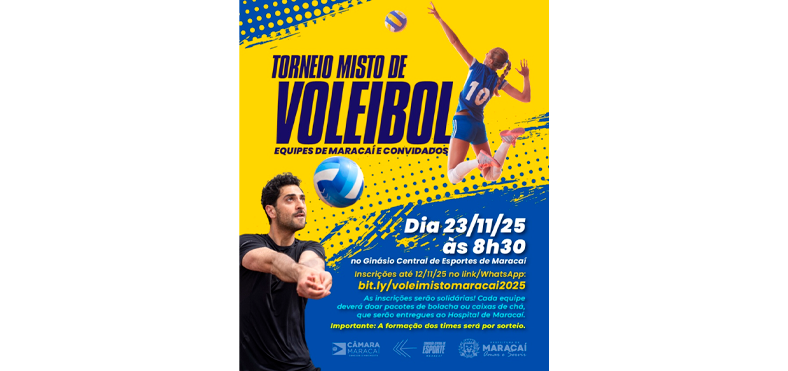 A Prefeitura de Maracaí, por meio da Comissão Central de Esporte, promoverá no domingo, 23 de novembro de 2025, o Torneio Misto de Voleibol, reunindo equipes do município e convidados em uma manhã de integração esportiva e solidariedade. O evento será realizado a partir das 8h30, no Ginásio Central de Esportes de Maracaí.