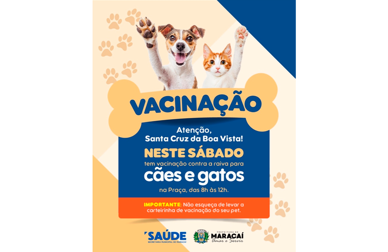 A Prefeitura de Maracaí, por meio da Secretaria Municipal de Saúde, realiza neste sábado, 18 de outubro, mais uma etapa da campanha de vacinação antirrábica voltada para cães e gatos de estimação. A aplicação será feita gratuitamente, das 8h às 12h, na Praça de Santa Cruz da Boa Vista.