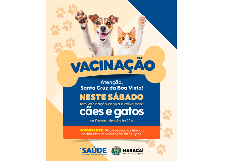 A Prefeitura de Maracaí, por meio da Secretaria Municipal de Saúde, realiza neste sábado, 1º de novembro, mais uma etapa da campanha de vacinação contra a raiva animal, voltada para cães e gatos de estimação. A ação será realizada na Praça de Santa Cruz da Boa Vista, das 8h às 12h, com atendimento gratuito à população.