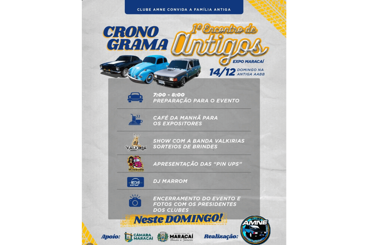 O 1º Encontro de Antigos será realizado neste domingo, 14 de dezembro, na antiga AABB de Maracaí, com programação que começa às 7h e reúne exposição de veículos, atrações musicais e atividades culturais. A iniciativa integra a Expo Maracaí e tem apoio da Prefeitura de Maracaí e da Câmara Municipal.