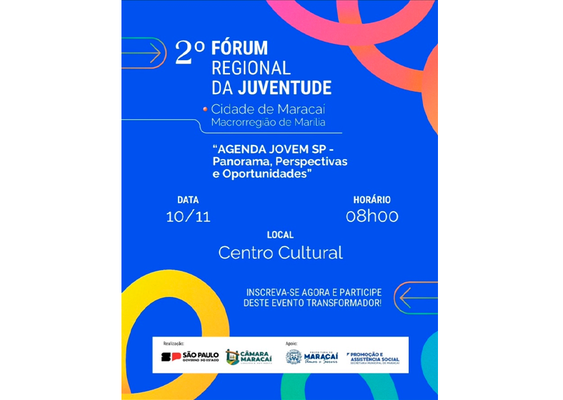 A Câmara Municipal de Maracaí, em parceria com a Coordenadoria Estadual da Juventude, promove no dia 10 de novembro, a partir das 8h, o 2º Fórum Regional da Juventude, que terá como tema central “Agenda Jovem SP – Panorama, Perspectivas e Oportunidades”. O evento acontecerá no Centro Cultural de Maracaí e tem como objetivo ampliar o diálogo e fortalecer a participação dos jovens na construção de políticas públicas voltadas à juventude.