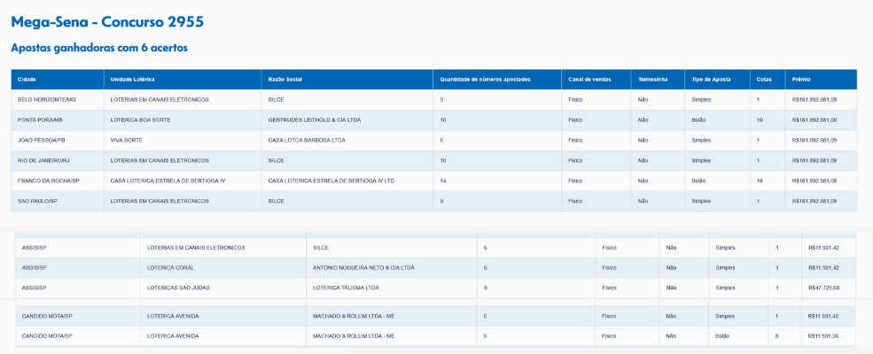 Na faixa da Quina, 3.921 apostas foram premiadas, com valor individual de R$ 11.931,42. O levantamento mostra uma presença significativa de apostas físicas realizadas em lotéricas do interior paulista, reforçando o papel das casas lotéricas regionais mesmo em um concurso marcado pelo alto volume de apostas digitais.