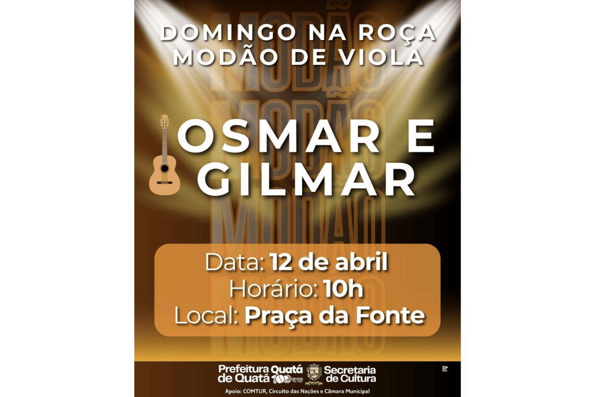 A cidade de Quatá recebe neste domingo (12), a partir das 10h, mais uma edição do “Domingo na Roça – Modão de Viola”, com apresentação da dupla Osmar e Gilmar. O evento será realizado na Praça da Fonte e tem entrada gratuita.