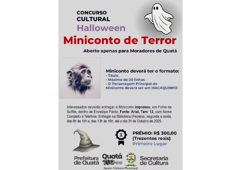 A Prefeitura de Quatá, por meio da Secretaria Municipal de Cultura, abriu as inscrições para o Concurso Cultural de Halloween – Miniconto de Terror, que vai premiar com R$ 300,00 o autor do melhor texto. A proposta é estimular a criatividade dos moradores e promover o hábito da escrita, em clima de diversão e imaginação.
