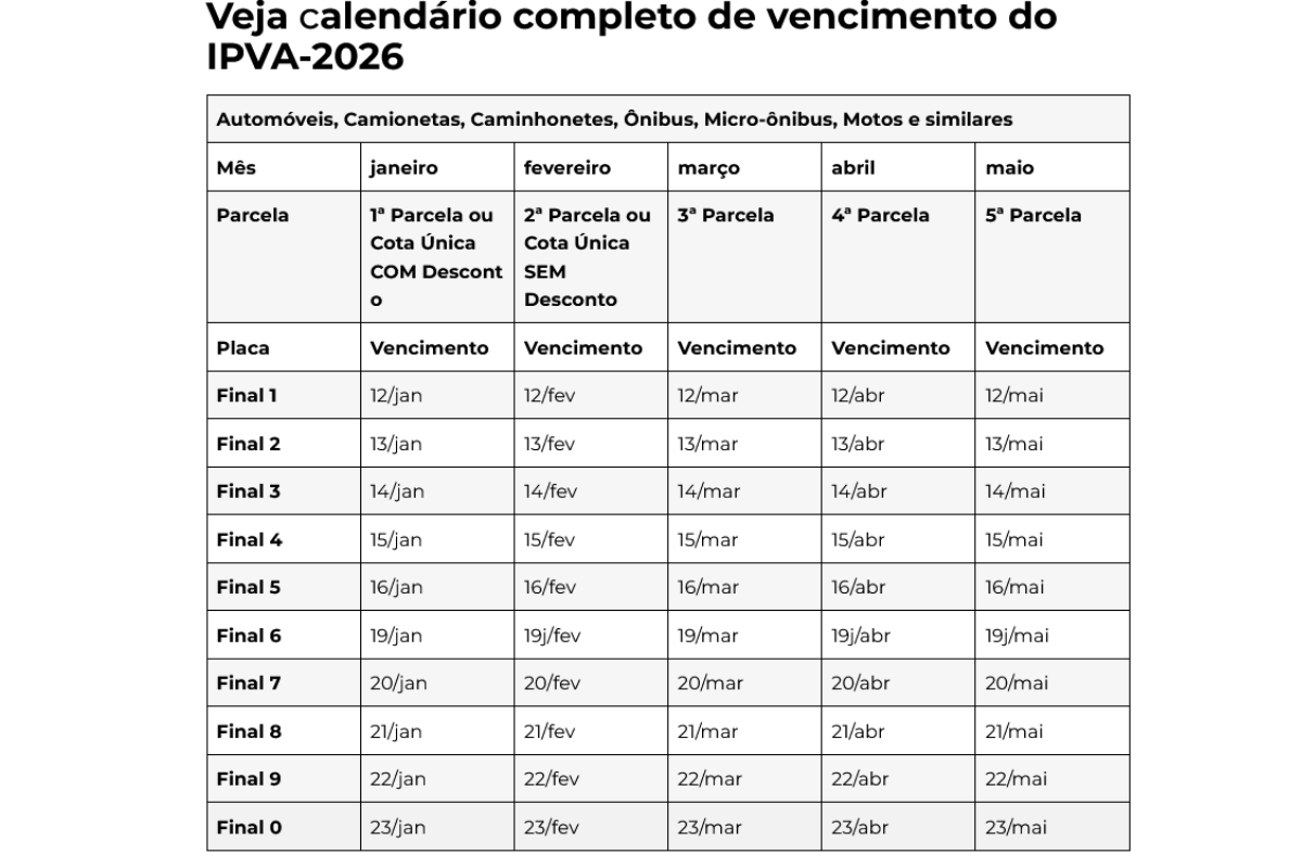 O calendário de pagamento do IPVA 2026 no estado de São Paulo começa nesta segunda-feira (12) para os proprietários de veículos que optarem pelo pagamento à vista com desconto ou pelo parcelamento do imposto. O cronograma segue o final da placa do veículo, conforme regras definidas pela Secretaria da Fazenda e Planejamento de Sao Paulo.