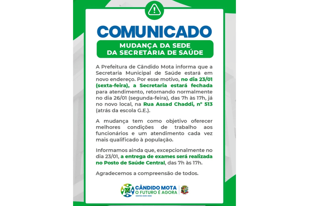 A Secretaria Municipal de Saúde de Cândido Mota retomou normalmente o atendimento ao público nesta segunda-feira, 26 de janeiro, já em novo endereço, após a mudança oficial de sede realizada ao longo do fim de semana.