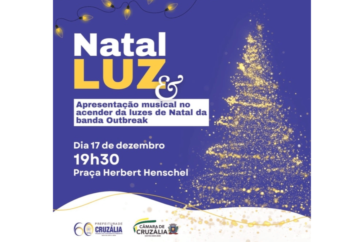 A Prefeitura de Cruzália realiza nesta quarta-feira, 17 de dezembro, a partir das 19h30, o evento Natal Luz, que marca oficialmente o acendimento das luzes natalinas no município. A programação acontece na Praça Herbert Henschel e contará com apresentação musical da banda Outbreak, aberta ao público.