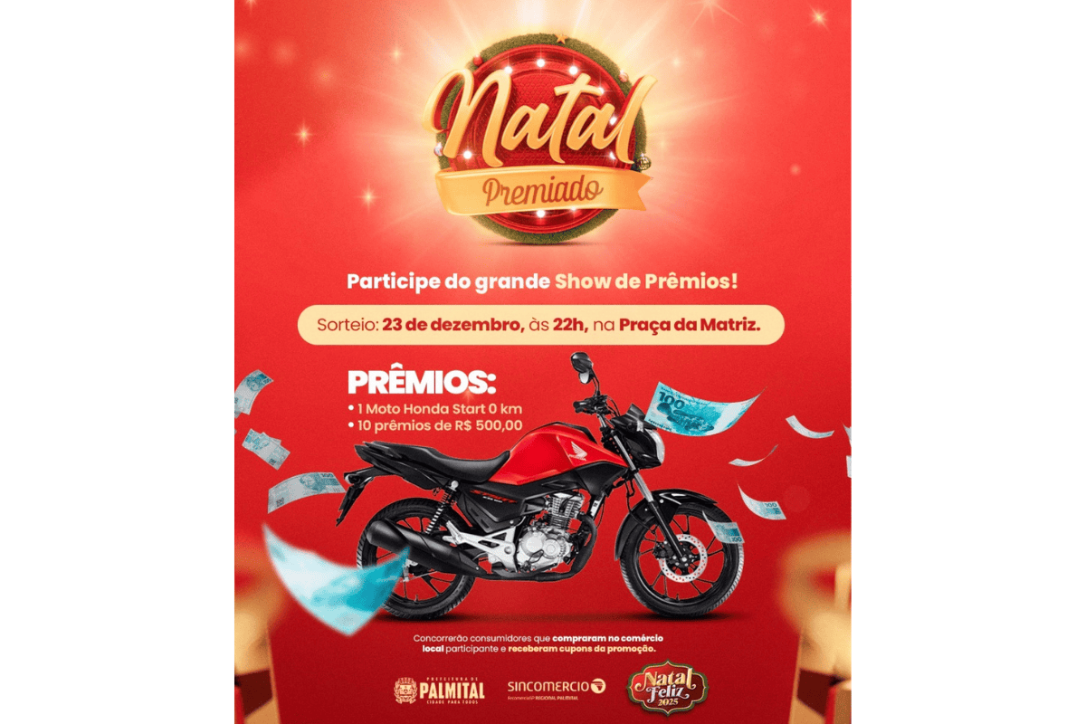Natal Premiado sorteará moto e vales de compras durante encerramento em Palmital
