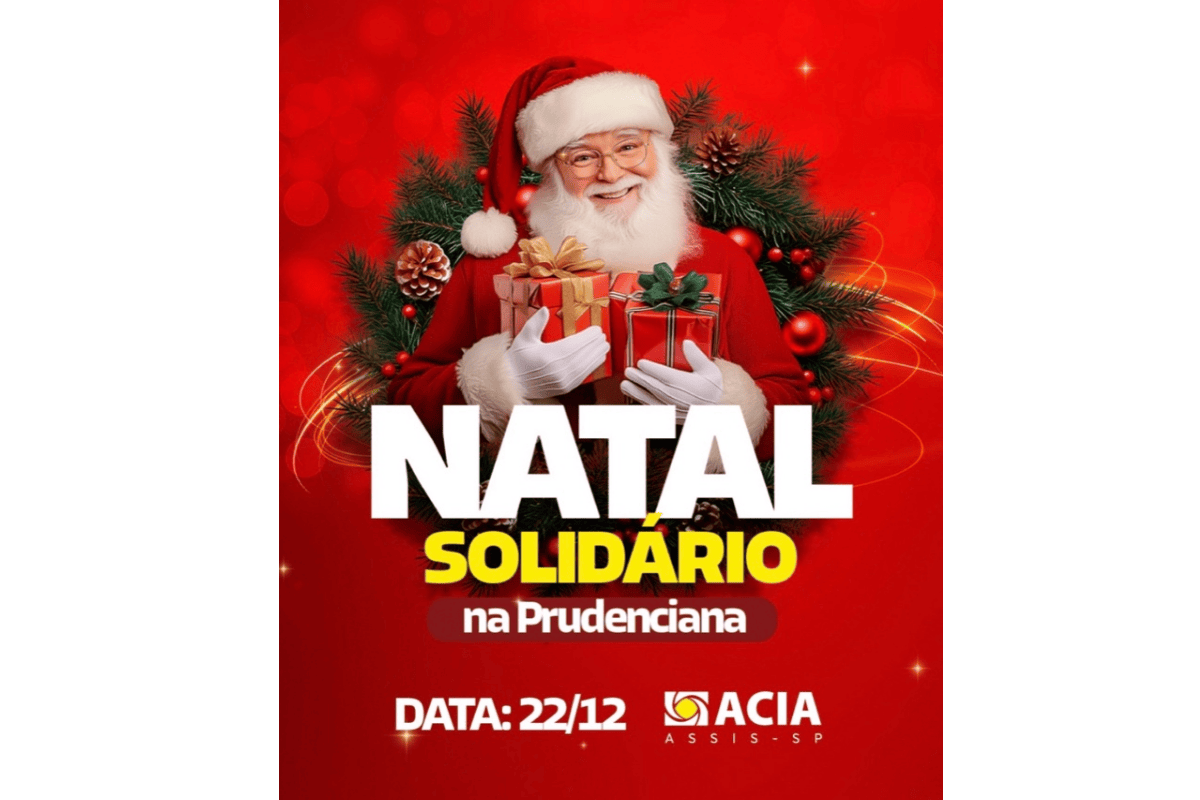 O clima de Natal segue forte em Assis nesta reta final de dezembro. Nesta segunda-feira, dia 22, a Associação Comercial e Industrial de Assis (ACIA) promove o Natal Solidário na Prudenciana, uma ação gratuita que reúne Papai Noel, brinquedos, atrações recreativas e atividades voltadas às famílias da cidade.