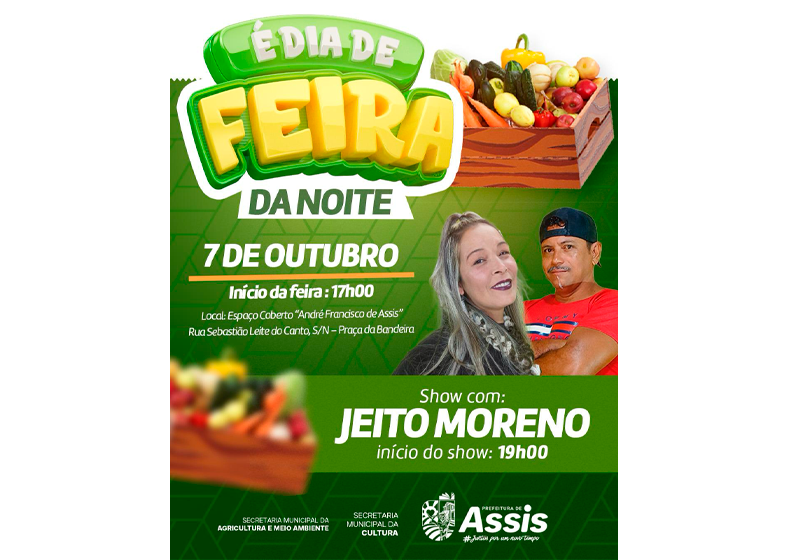 A Feira da Noite é uma realização da Prefeitura de Assis, por meio da Secretaria Municipal de Agricultura e Meio Ambiente e da Secretaria Municipal da Cultura.