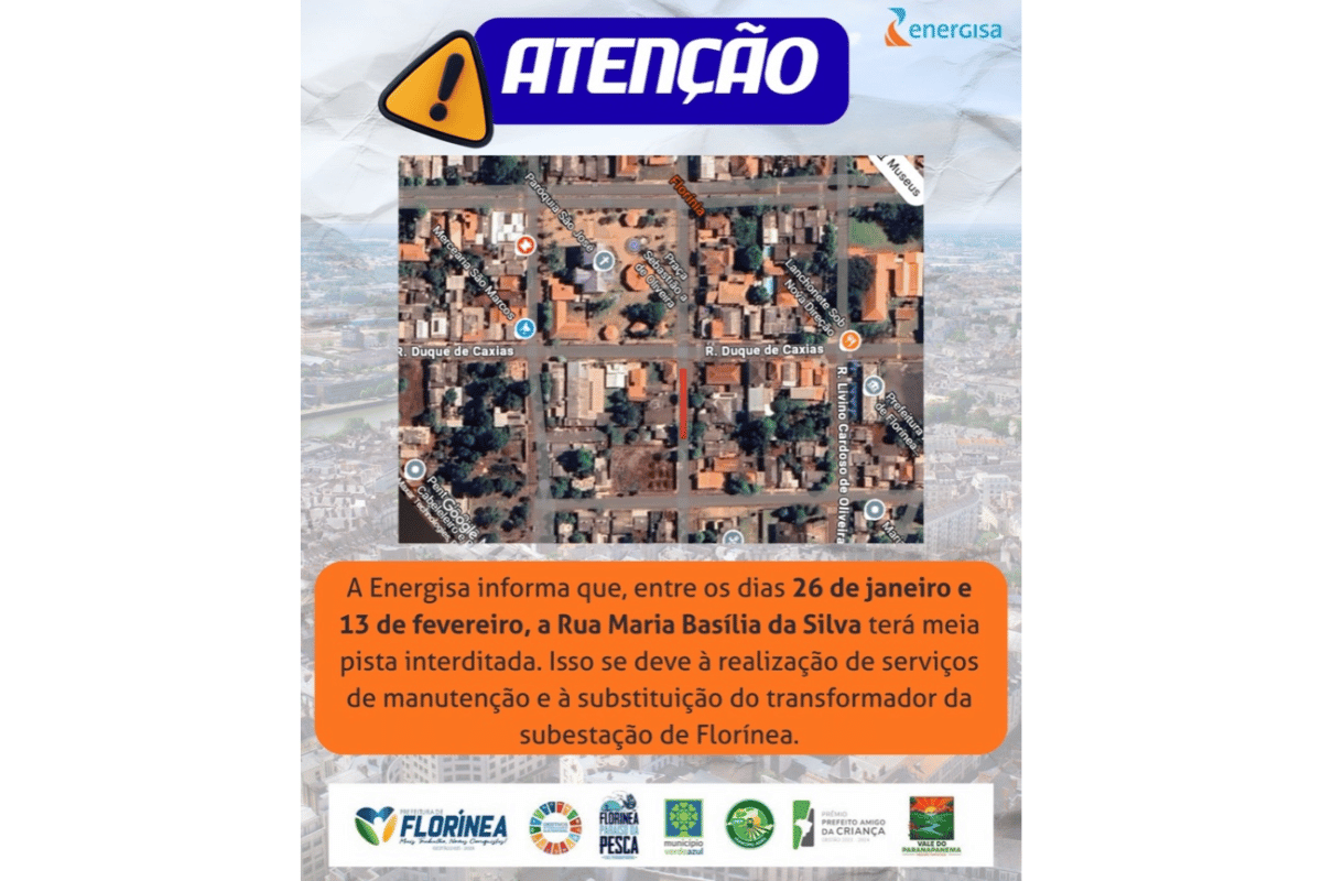 A Energisa informa que as intervenções têm caráter preventivo e estruturante, com o objetivo de garantir maior estabilidade no sistema elétrico da cidade. A Prefeitura de Florínea reforça o pedido de compreensão da população pelos transtornos temporários causados pela interdição parcial da via.
