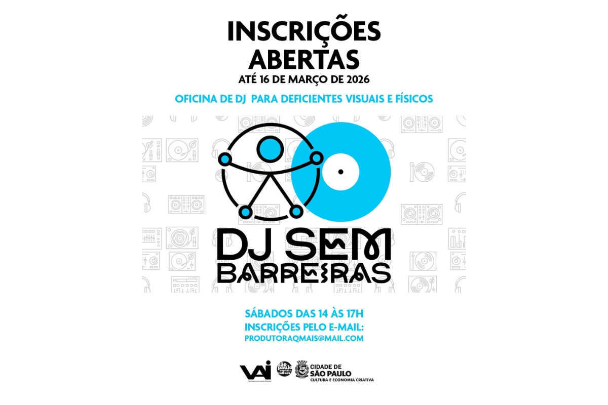 O Projeto DJ sem Barreiras está com inscrições abertas até 16 de março para oficinas gratuitas de DJ destinadas a pessoas com deficiência visual e ou física, na cidade de São Paulo. As aulas começam em 21 de março, sempre aos sábados, das 14h às 17h, na Vinil Brasil, fábrica de vinil localizada no bairro do Bom Retiro. A iniciativa busca ampliar o acesso à formação musical com metodologia prática, recursos adaptados e transporte gratuito do metrô até o local das atividades.