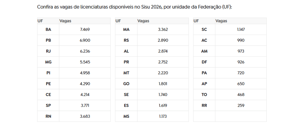 No Sisu 2026, as licenciaturas com maior número de vagas são ciências biológicas, pedagogia, matemática, história e geografia. Ao todo, o processo seletivo reúne mais de 274 mil vagas em diferentes áreas, ofertadas por 136 instituições públicas de ensino superior, o que consolida esta edição como a maior da história do sistema em número de instituições participantes.