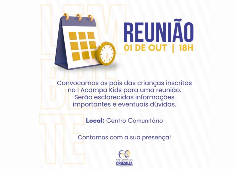 A Prefeitura de Cruzália convocou os pais e responsáveis das crianças inscritas no I Acampa Kids para uma reunião preparatória. O encontro será realizado nesta quarta-feira, dia 1º de outubro, às 18h, no Centro Comunitário, com o objetivo de esclarecer informações importantes sobre o evento e tirar eventuais dúvidas quanto à participação dos inscritos.